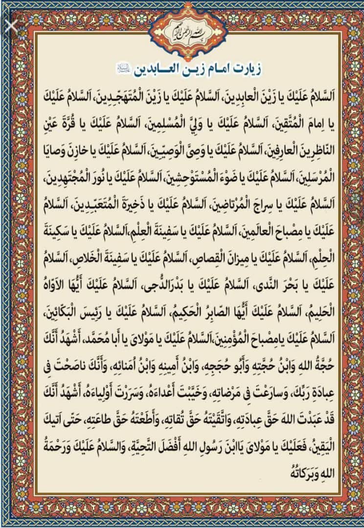 السَّلاَمُ عَلَيْكَ يَا زَيْنَ الْعَابِدِين، السَّلاَمُ عَلَيْكَ يَا زَيْنَ الْمُتَهَجِّدِين، السَّلاَمُ عَلَيْكَ يَا إِمَامَ المُتَّقِين، السَّلاَمُ عَلَيْكَ يَا دُرَّةَ الصَّالِحِين، السَّلاَمُ عَلَيْكَ يَا وَلِيَّ الْمُسْلِمِين، السَّلاَمُ عَلَيْكَ يَا قَرَّةَ عَيْنِ النَّاظِرِين الْعَارِفِين، السَّلاَمُ عَلَيْكَ يَا خَلَفَ السَّابِقِين، السَّلاَمُ عَلَيْكَ يَا وَصِيَّ الْوَصِيِّيْن ، السَّلاَمُ عَلَيْكَ يَا خَازِنَ وَصَايَا الْمُرْسَلِين، السَّلاَمُ عَلَيْكَ يَا ضَوْءَ الْمُسْتَوْحِشِين، السَّلاَمُ عَلَيْكَ يَا نُورَ الْمُجْتَهِدِين، السَّلاَمُ عَلَيْكَ يَا سِرَاجَ الْمُرْتَاضِين، السَّلاَمُ عَلَيْكَ يَا ذُخْرَ الْمُتَعَبِّدِين، السَّلاَمُ عَلَيْكَ يَا مِصْبَاحَ الْعَالِمِين، السَّلاَمُ عَلَيْكَ يَا سَفِينَةَ الْعِلْم، السَّلاَمُ عَلَيْكَ يَا سِكِينَةَ الْحِلْم ، السَّلاَمُ عَلَيْكَ يَا مِيزَانَ الْقَصَاص، السَّلاَمُ عَلَيْكَ يَا سَفِينَةَ الْخَلاَص، السَّلاَمُ عَلَيْكَ يَا بَحْرَ النَّدَى، السَّلاَمُ عَلَيْكَ يَا بَدْرَ الدُّجَى، السَّلاَمُ عَلَيْكَ أَيُّهَا الْأَوَّاهُ الْحَلِيمُ، السَّلاَمُ عَلَيْكَ أَيُّهَا الصَّابِرُ الْحَكِيمُ، السَّلاَمُ عَلَيْكَ يَا رَئِيسَ الْبَاكِين، السَّلاَمُ عَلَيْكَ يَا مِصْبَاحَ الْمُؤْمِنِين ، السَّلاَمُ عَلَيْكَ يَا مَوْلَايَ يَا أَبَا مُحَمَّدٍ أَشْهَدُ أَنَّكَ حُجَّةُ اللهِ وَابْن حُجَّتُه وَأَبُو حِجَجِهِ وَابْنُ أَمِينِهِ وَأَبُو أَمْنَائِهِ وَأَنَّكَ نَاصَحْتَ فِي عِبَادَةِ رَبِّكَ وَسَارَعْتَ فِي مَرْضَاتِهِ، وَخَيَّبْتَ أَعْدَاءِه، وَسَرَّرْتَ أَوْلِيَاءَه، أَشْهَدُ أَنَّكَ قَدْ عَبَدْتَ اللهَ حَقَّ عِبَادَتِهِ، وَاتَّقَيْتَهُ حَقَّ تُقَاتِه وَأَطَعْتَهُ حَقَّ إِطَاعَتِه حَتَّى أَتَاكَ الْيَقِين، فَعَلَيْكَ يَا مَوْلَايَ يَا ابْنَ رَسُولِ الله أَفْضَلَ التَّحِيَّةِ وَالسَّلاَم وَرَحْمَةُ اللهِ وَبَرَكَاتُه