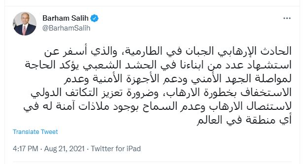 وقال صالح في تغريدة له إن "الحادث الإرهابي الجبان في الطارمية، والذي أسفر عن استشهاد عدد من ابنائنا في الحشد الشعبي يؤكد الحاجة لمواصلة الجهد الأمني ودعم الأجهزة الأمنية وعدم الاستخفاف بخطورة الارهاب، وضرورة تعزيز التكاتف الدولي لاستئصال الارهاب وعدم السماح بوجود ملاذات آمنة له في أي منطقة في العالم".