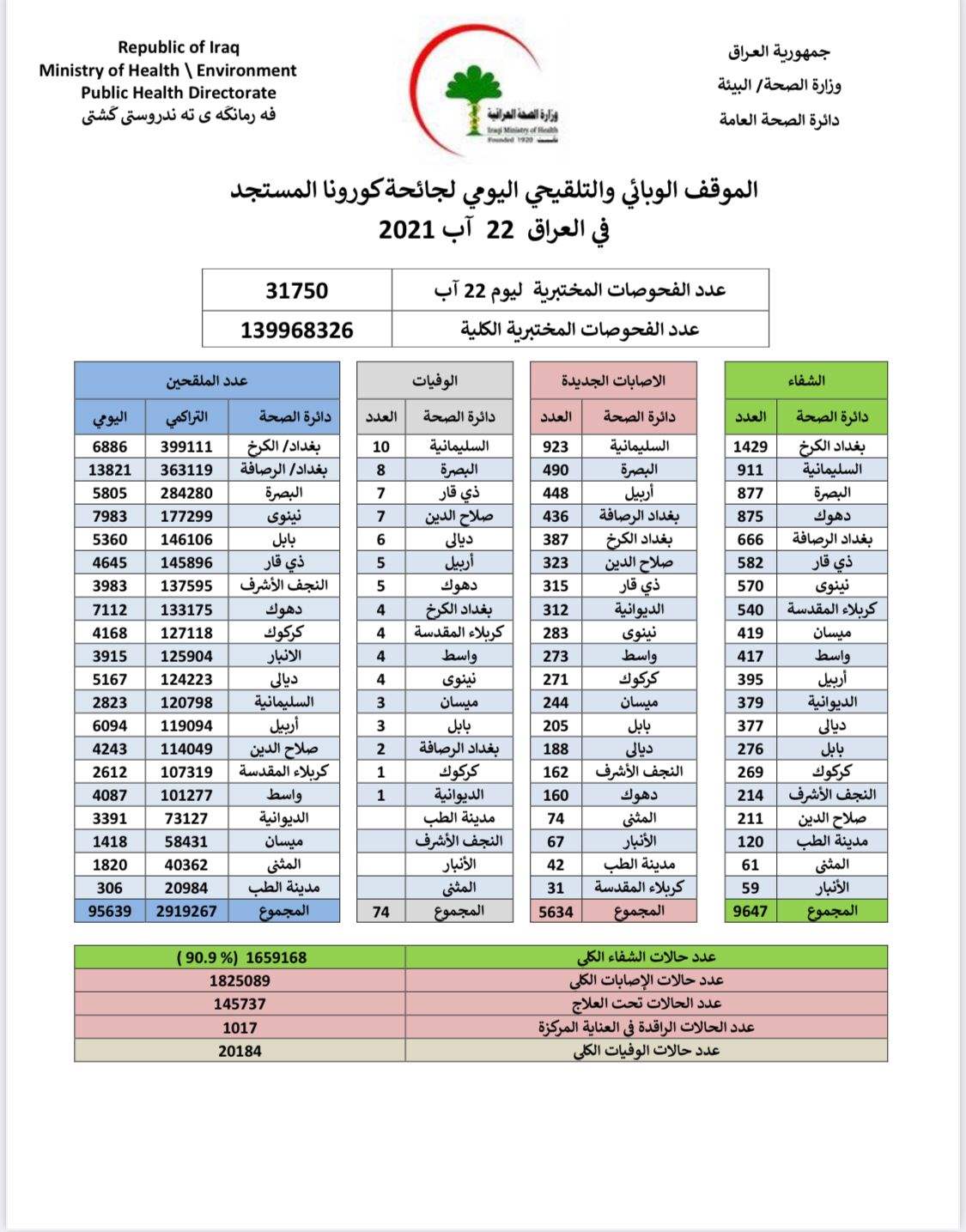 وقالت الوزارة في بيان، إنها "سجلت 5634 حالة إصابة، مقابل 9647 حالة شفاء، و 74 وفاة بالفيروس".