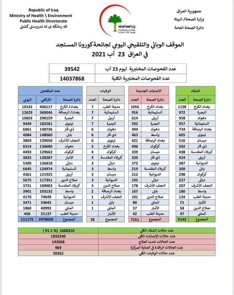 وقالت الوزارة في بيان، إنها "سجلت 7151 إصابة جديدة، مقابل تماثل 9142 حالة للشفاء، وتسجيل 78 حالة وفاة بكورونا".