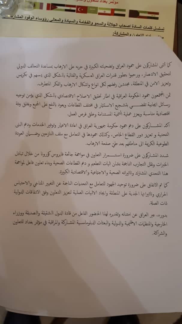 وجدد المشاركون دعمهم لجهود الحكومة العراقية في تعزيز مؤسسات الدولة واجراء الانتخابات الممثلة للشعب العراقي، كما جددوا دعمهم لجهود الحكومة العراقية في تعزيز مؤسسات الدولة واجراء الانتخابات الممثلة للشعب العراقي.