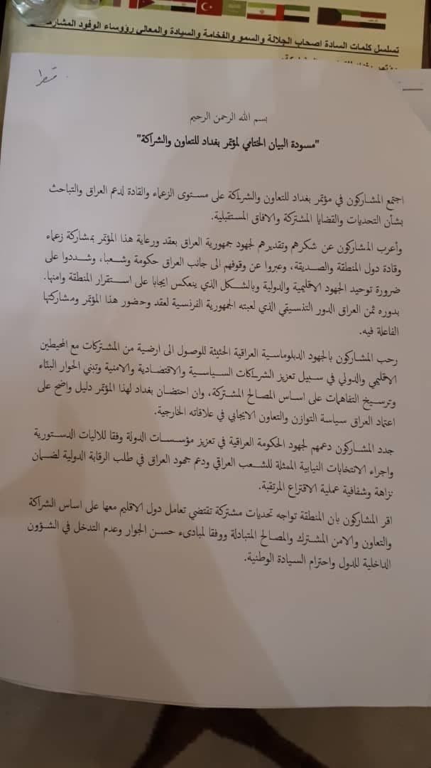 وجاء في البيان ، ان المشاركين شددوا على ضرورة توحيد الجهود الاقليمية والدولية بما ينعكس ايجابا على استقرار المنطقة وأمنها، فيما رحبوا بالجهود الدبلوماسية العراقية للوصول الى ارضية من المشتركات مع المحيطين الاقليمي والدولي.