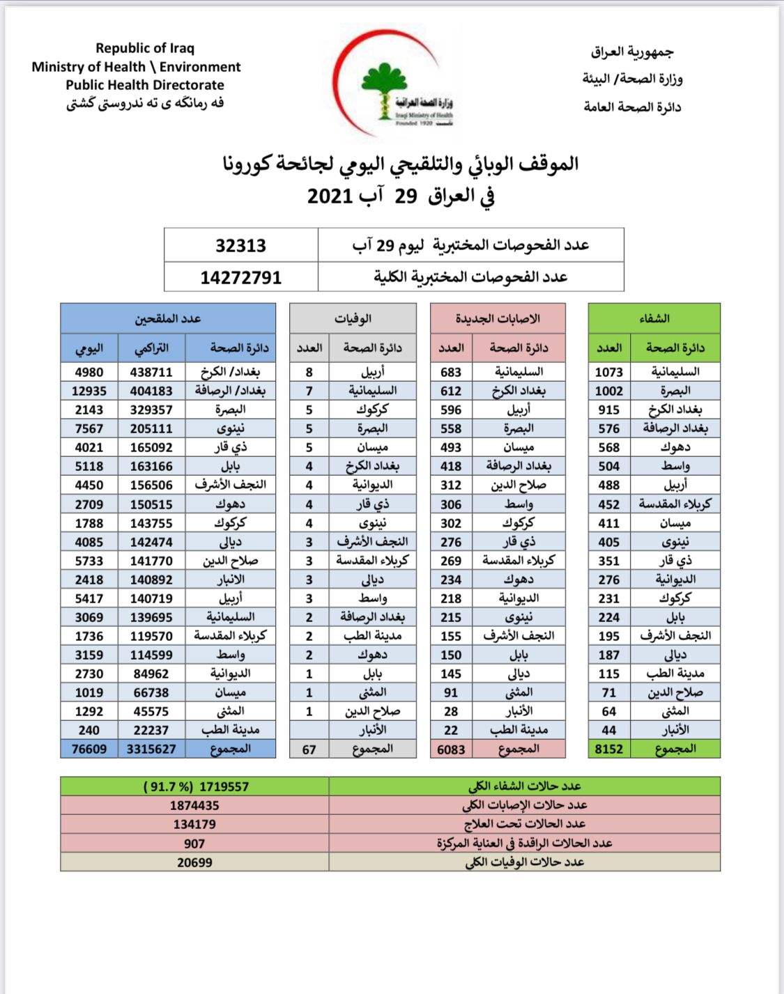 وقالت الوزارة في بيان، إن "كوادرها سجلت 6083 حالة إصابة جديدة، و 8152 حالة شفاء، و 67 وفاة بالفيروس".
