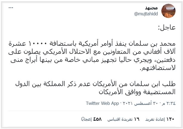 وقال مجتهد في تغريدة ، إن العشرة آلاف أفغاني من المتعاونين سيصلون الرياض على دفعتين، مشيراً إلى أنه يجري حالياً تجهيز مباني خاصة من بينها أبراج منى لاستضافتهم.