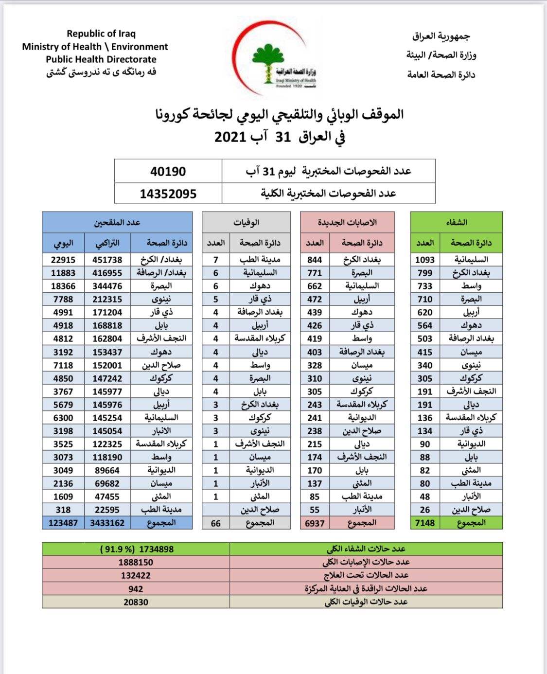 وقالت الوزارة في بيان، إن كوادرها "سجلت 6937 حالة إصابة جديدة، مقابل تماثل 7148 حالة شفاء، و 66 وفاة بالفيروس". وبينت، أنه "تم تلقي 123487 شخصاً للقاح كورونا خلال يوم واحد".