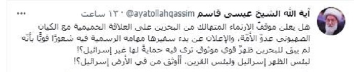 وأدان المرجع الكبير في البحرين آية الله الشيخ عيسى قاسم إنشاء علاقاتٍ مع الكيان الصهيوني، سائلًا عبر حسابه على "تويتر": "هل يعلن موقفُ الارتماء المتهالك من البحرين على العلاقة الحميمية مع الكيان الصهيوني عدوّ الأمّة، والإعلان عن بدء سفيرها مهامه الرسمية فيه شعورًا قويًّا بأنّه لم يبق للبحرين ظهرٌ قوي موثوق ترى فيه حمايةً لها غيرالكيان الصهيوني!".