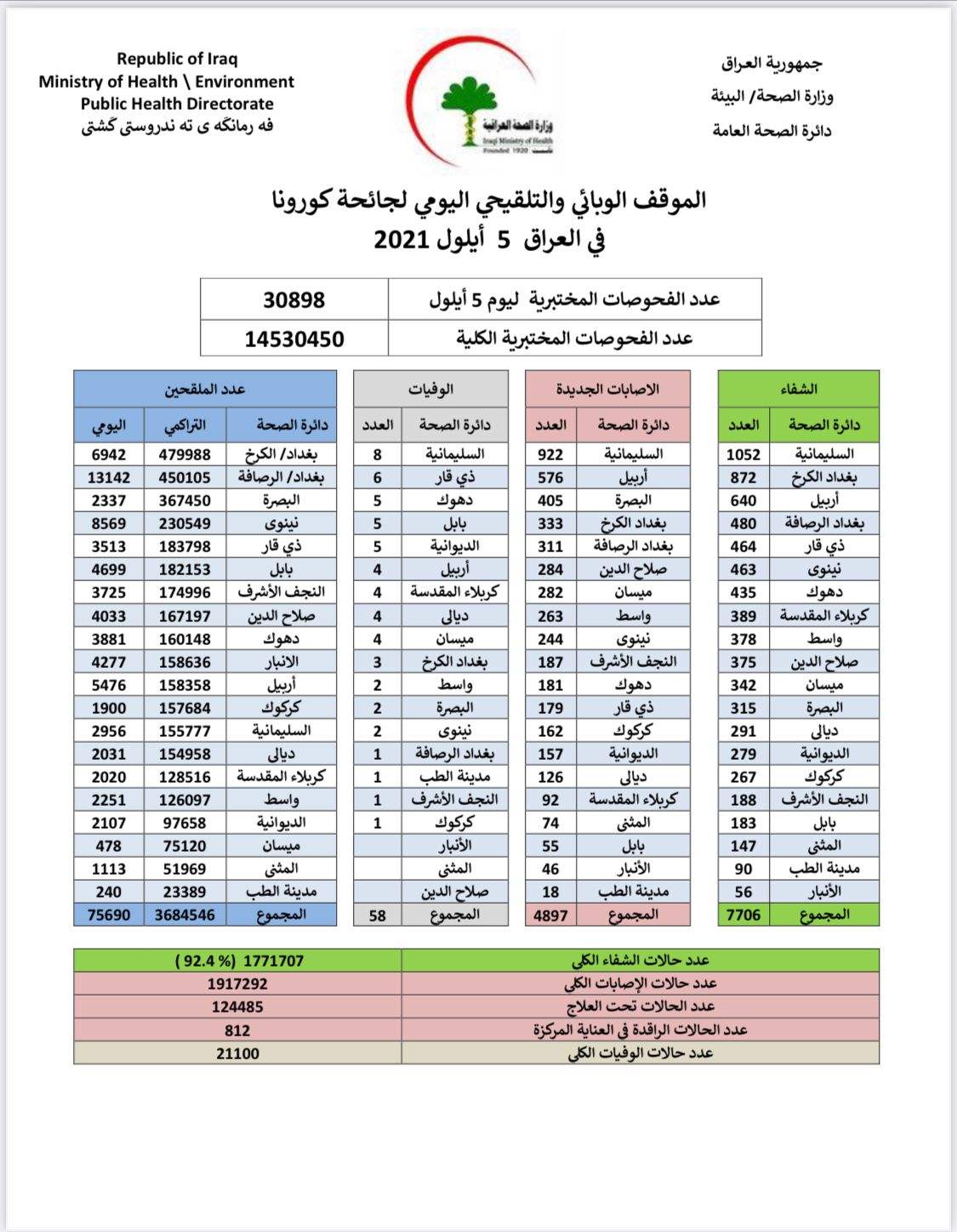 وقالت الوزارة في بيان، إن "كوادرها سجلت 4897 إصابة جديدة، مقابل تماثل 7706 حالة للشفاء، و 58 وفاة بالفيروس". وأشارت إلى "تلقي 75690 شخصاً للقاحات المضادة لفيروس كورونا، خلال يوم واحد".