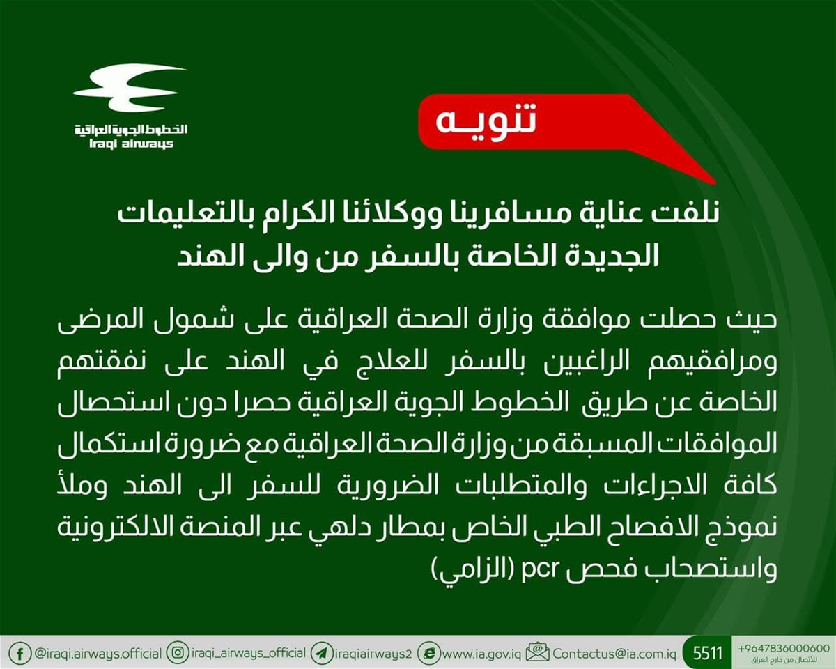 وذكرت وزارة النقل في بيان ، أن "وزارة الصحة وافقت على سفر المرضى ومرافقيهم إلى الهند دون الحصول على الموافقات المسبقة، شرط الالتزام بالاجراءات الوقائية".