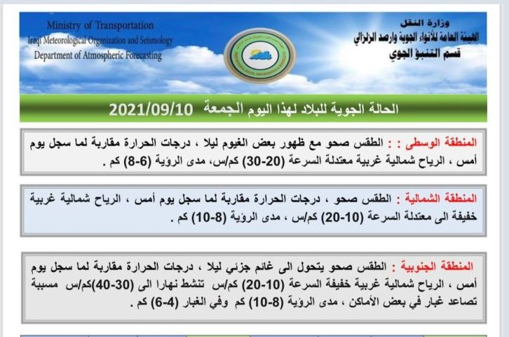 أعلنت هيئة الأنواء الجوية العراقية، الجمعة، عن حالة الطقس في البلاد للأيام المقبلة.