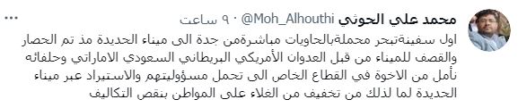 وفي تغريدة له على تويتر، قال الحوثي إن أول سفينة حاويات ستبحر من ميناء جدة الى ميناء الحديدة منذ فرض الحصار وقصف الميناء من قبل تحالف العدوانِ السعودي.
