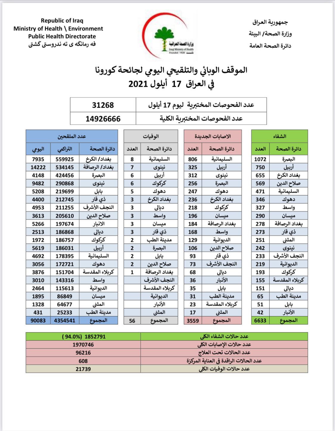 وبحسب الموقف الوبائي ، فقد "سجلت الصحة انخفاضا باصابات كورونا خلال الساعات الاربع والعشرين الماضية عند 3559 إصابة جديدة"، فيما تم تسجيل وفاة 56 مصابا"، بارتفاع ملحوظ مقارنة باليوم السابق.
