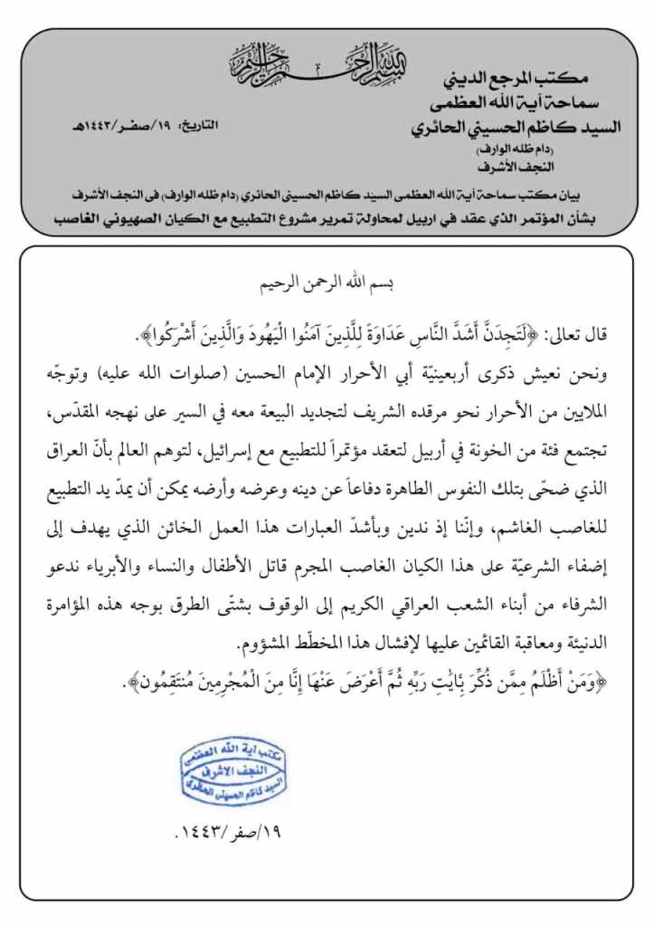 وعبّر المرجع الحائري، عن “إدانته بأشد العبارات هذا العمل الخائن الذي يهدف الى إضفاء الشرعية على هذا الكيان الغاصب المجرم قاتل الاطفال والنساء والابرياء”.