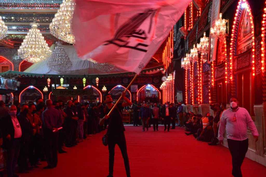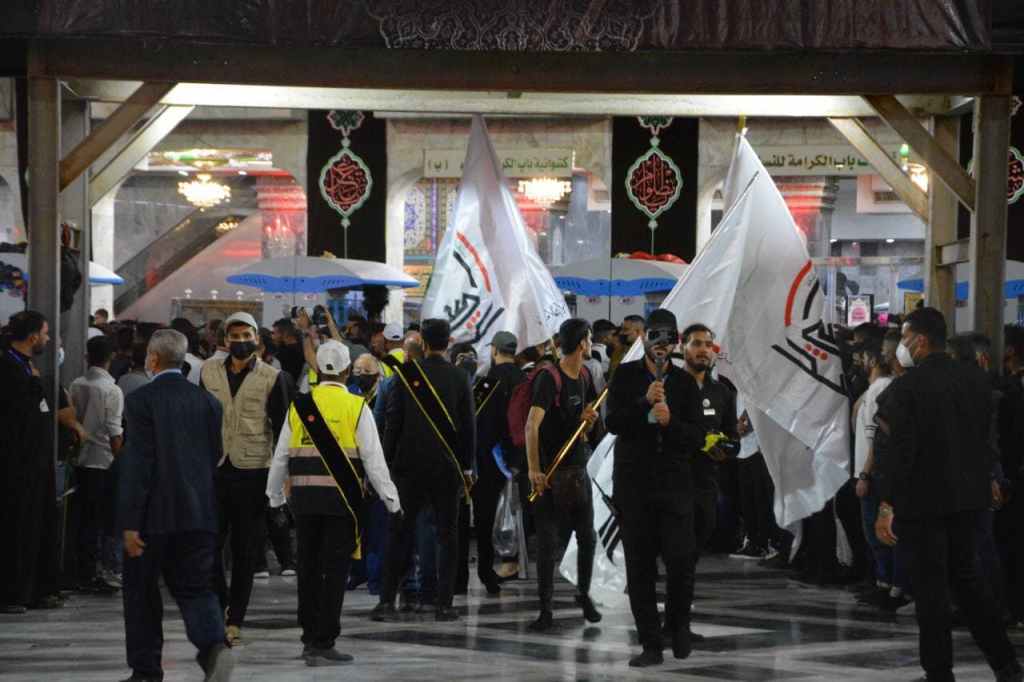 وتقدم الموكب صورة الشهيد أبو مهدي المهندس ورايات الحشد الشعبي، في إشارة إلى الجهود الكبيرة التي بذلها الشهيد وقوات الحشد في حماية أرض العراق وتأمين الزيارات المليونية في كل عام.