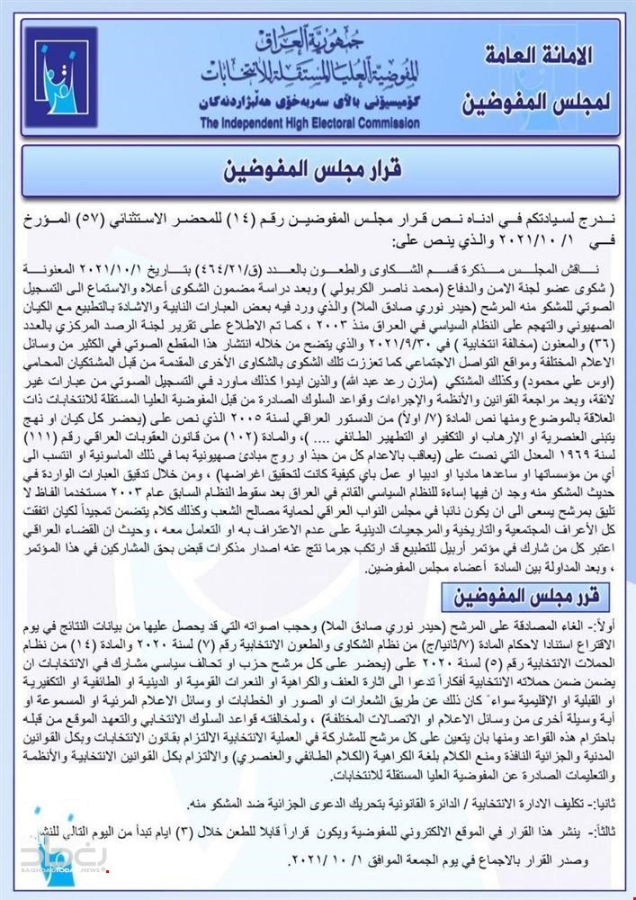 وقالت الهيئة في بيان اليوم، (5 ايلول 2021)، ان "الهيئة القضائية الانتخابية في محكمة التمييز ترد الطعن المقدم من المرشح حيدر الملا وتصادق على قرار مجلس المفوضين الذي قضى باستبعاده".