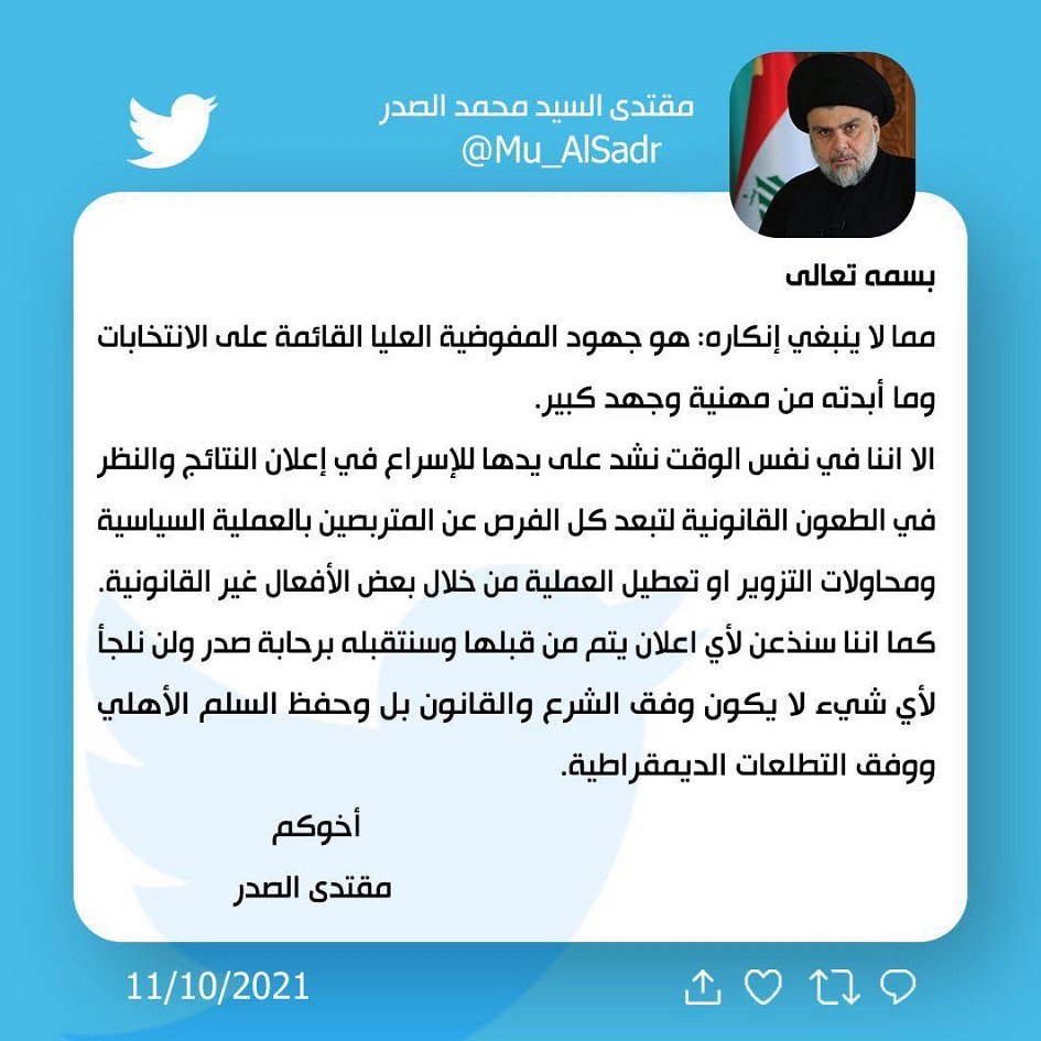 وقال الصدر في تغريدة على تويتر "مما لا ينبغي إنكاره: هو جهود المفوضية العليا القائمة على الانتخابات وما أبدته من مهنية وجهد كبير".