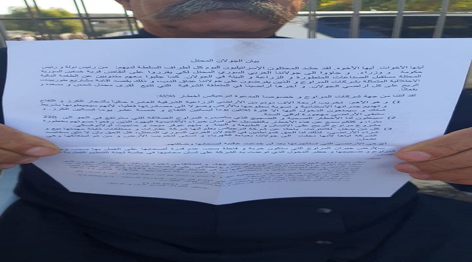 وقال أهالي الجولان السوري في بيان لهم خلال وقفة احتجاجية اليوم في قرية مسعدة: نعلن باسم أهالي الجولان العربي السوي المحتل وانطلاقاً من اعتزازنا بالإرث النضالي المقاوم الذي منحنا إياه الآباء والأجداد رفضنا إقامة أي مخطط احتلالي على أراضنا التي هي ملك لنا منذ مئات السنين ودفع أجدادنا دماءهم حفاظاً عليها وسنمنع المحتل الإسرائيلي من الاستيلاء على أرضنا.