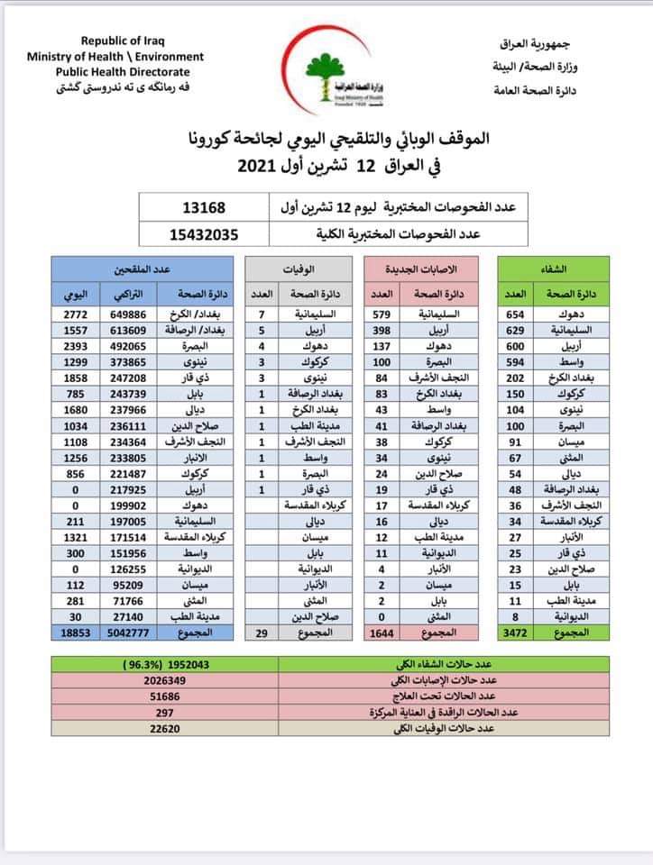 وقالت الوزارة في بيان، إن "كوادرها سجلت 1644 إصابة جديدة، مقابل تماثل 3472 حالة للشفاء، و29 حالة وفاة بالفيروس".