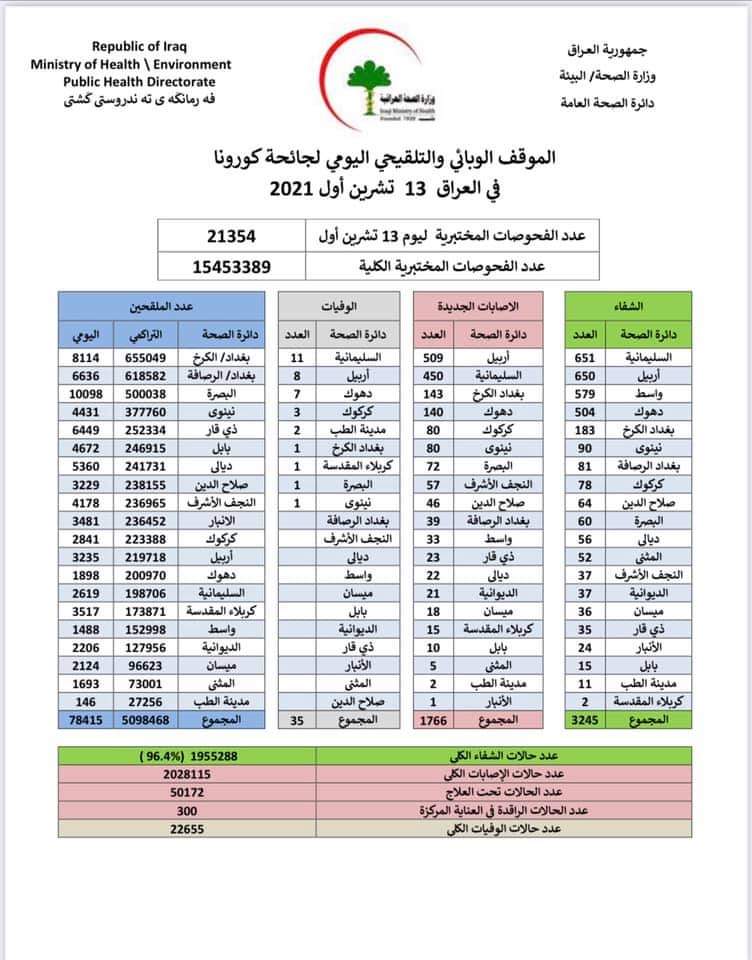 وقالت الوزارة في بيان ، ان "كوادرها سجلت 1766 اصابة جديدة فيما سجلت 35 حالة وفاة جراء مضاعفات الفيروس"، مشيرة الى تماثل 3245 حالة للشفاء". واضافت انه " تلقى 78415 شخصا للقاحات المضادة لفيروس كورونا في مراكز تلقي القاح المنتشرة في عموم البلاد".
