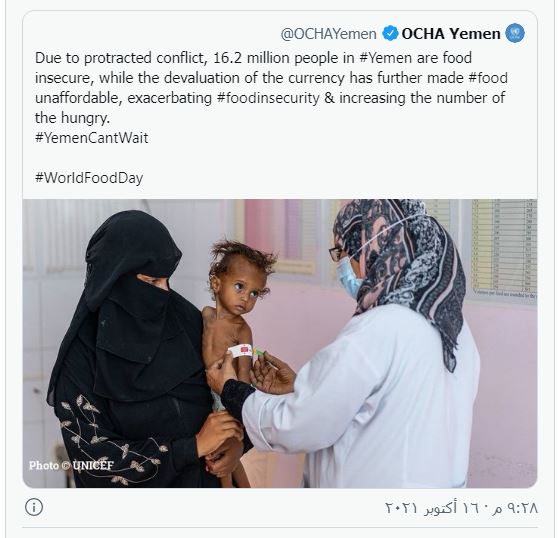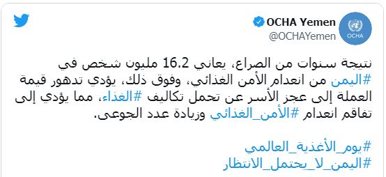 وقال مكتب المنظمة الدولية في اليمن، في تغريدة على حسابه في "تويتر"، إنه "نتيجة سنوات من الصراع يعاني 16.2 مليون شخص في اليمن من انعدام الأمن الغذائي".