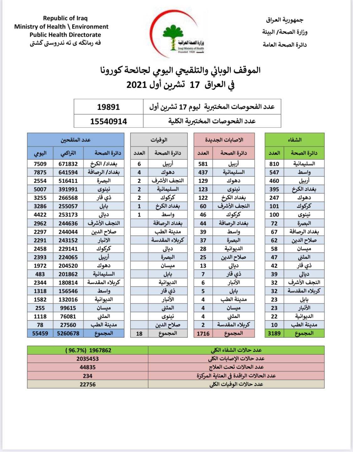 وقالت الوزارة في بيان، إن "كوادرها سجلت 1716 حالة إصابة جديدة، مقابل 3189 حالة شفاء، و 18 وفاة بالفيروس".