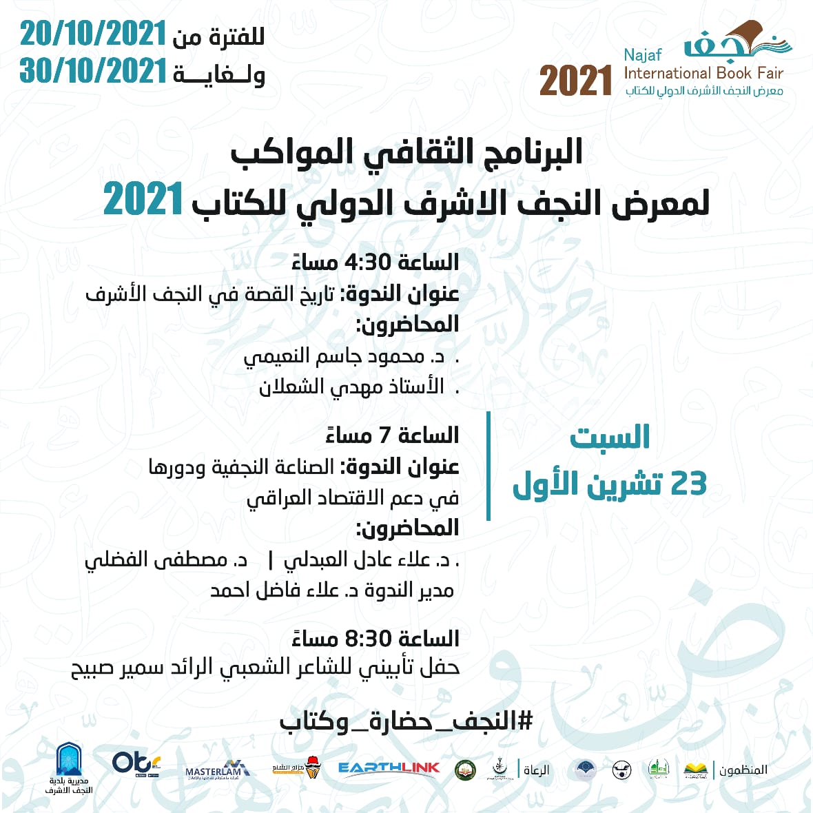 وعلى هامش معرض النجف الدولي للكتاب، يتضمن البرنامج الثقافي لهذا اليوم "السبت/23 تشرين الأول ندوتين وحفل تأبيني لشاعر المقاومة "سمير صبيح" كما هو موضح في البوستر المرفق: