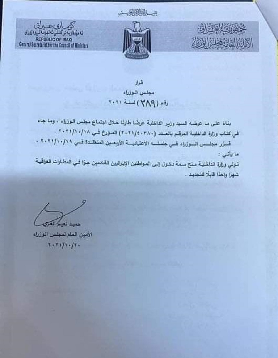 وبحسب كتاب للامانة العامة لمجلس الوزراء فانه "بناء على ماعرضه وزير الداخلية عرضاً طارئا خلال اجتماع مجلس الوزراء وماجاء في كتاب وزارة الداخلية المؤرخ في ١٨/١٠/٢٠٢١، قرر مجلس الوزراء في جلسته الاعتيادية الأربعين المنعقدة في ١٩/١٠/٢٠٢١ بتولي وزارة الداخلية منح سمة الدخول إلى المواطنين الايرانين القادمين جوا في المطارات العراقية شهرا واحدا قابلا للتجديد".