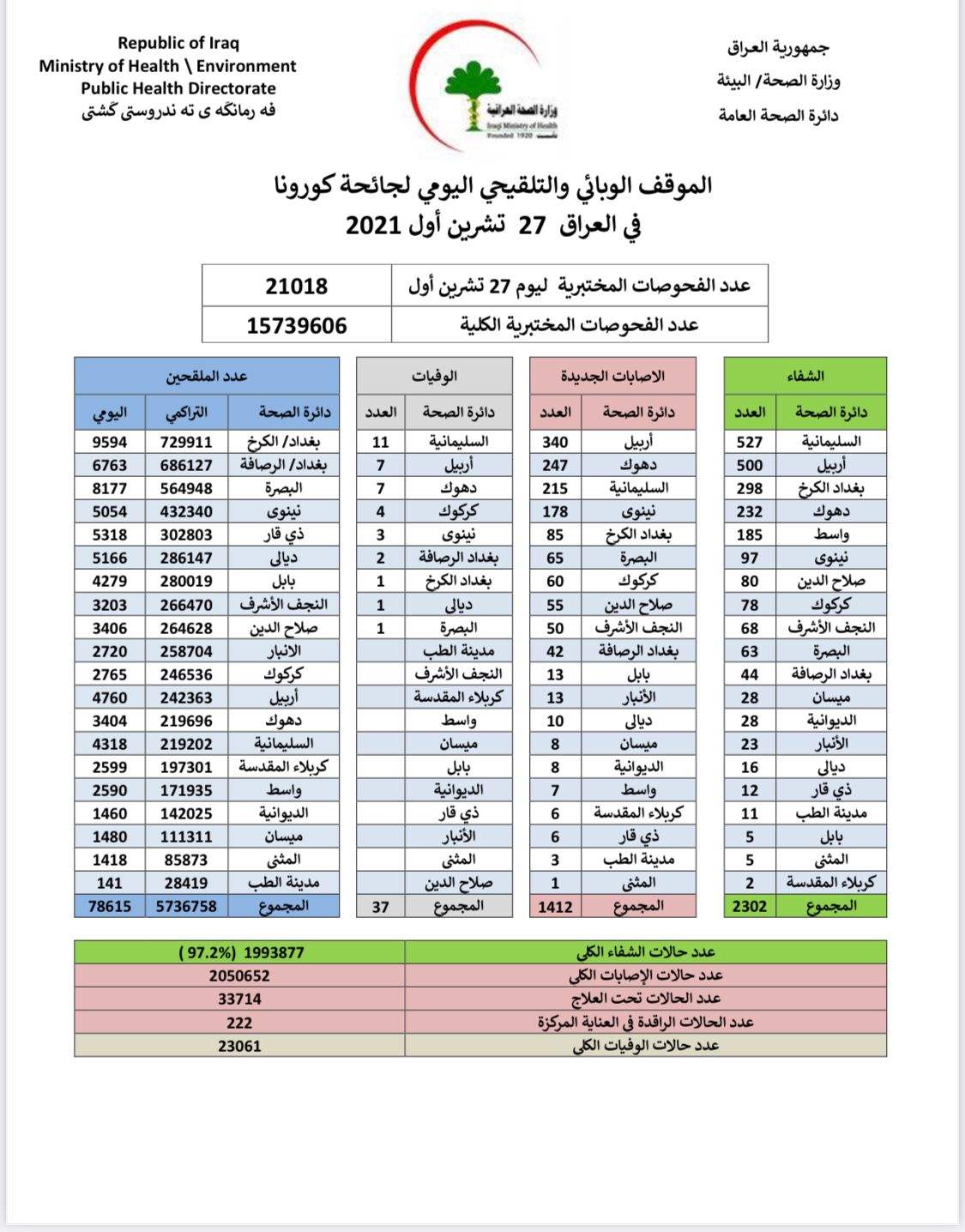 وقالت الوزارة في بيان، إن "كوادرها سجلت 1412 حالة إصابة جديدة، مقابل تماثل 2302 حالة للشفاء، و 37 وفاة بالفيروس". وأضافت، أن "78615 شخصاً تلقى لقاح كورونا في يوم واحد".
