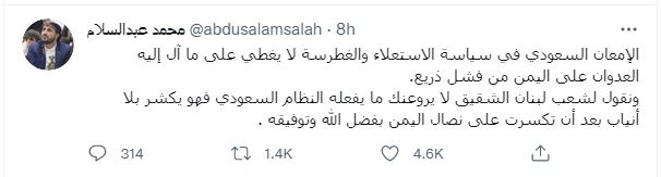 وخاطب عبد السلام في تغريدته على تويتر، الشعب اللبناني قائلًا : “لا يروّعنك ما يفعله النظام السعودي فهو يكشر بلا أنياب بعد أن تكسّرت على نصال اليمن بفضل الله وتوفيقه”.