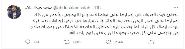 وقال محمد عبدالسلام في تغريدة له على تويتر: تخطئ قوى العدوان في إصرارها على مواصلة عدوانها الهمجي، وأخطر من ذلك إصرارها على خنق اليمن بحصارها الجائر.
