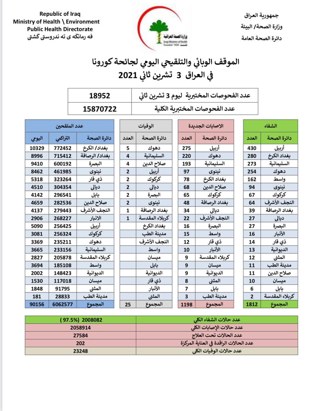 وبحسب الموقف الوبائي اليومي الذي اصدرته الصحة، فقد "سجل العراق 1198 اصابة جديدة بفيروس كورونا و 25 حالة وفاة خلال الساعات الـ 24 الماضية".