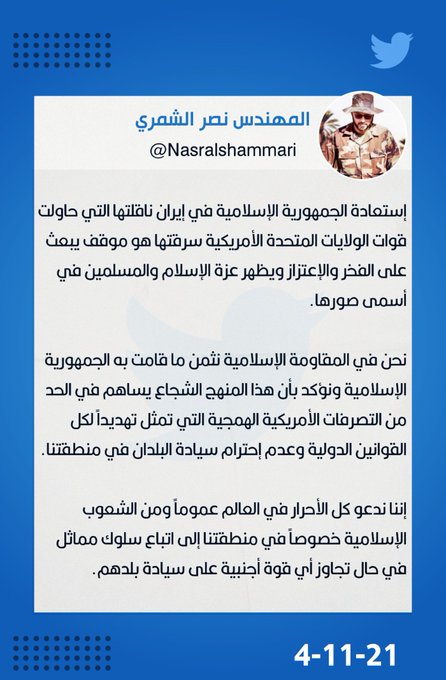 وأفاد مكتب الاعلام والعلاقات لحركة النجباء في الجمهورية الاسلامية الإيرانية، أن المتحدث باسم المقاومة الإسلامية - حركة النجباء وصف في تغريدة على تويتر استعادة ناقلة النفط الإيرانية من قرصنة القوات الأميركية بأنه موقف يبعث على الفخر والاعتزاز الذي أظهر عزة الإسلام والملسمين في أسمى صورها. وأشاد المهندس نصر الشمري بما قامت به الجمهورية الإسلامية الإيرانية من عمل شجاع، مؤكدا أن هذا المنهج الشجاع يساهم في الحد من التصرفات الهمجية الأميركية التي تمثل تهديدا لكل القوانين الدولية وعدم احترام سيادة البلدان في منطقتنا. وفي الختام دعا كل الاحرار في العالم عموما والشعوب الإسلامية خصوصا في المنطقة الى اتباع سلوك مماثل في حال تجاوز أي قوة أجنبية على سيادة بلدهم.
