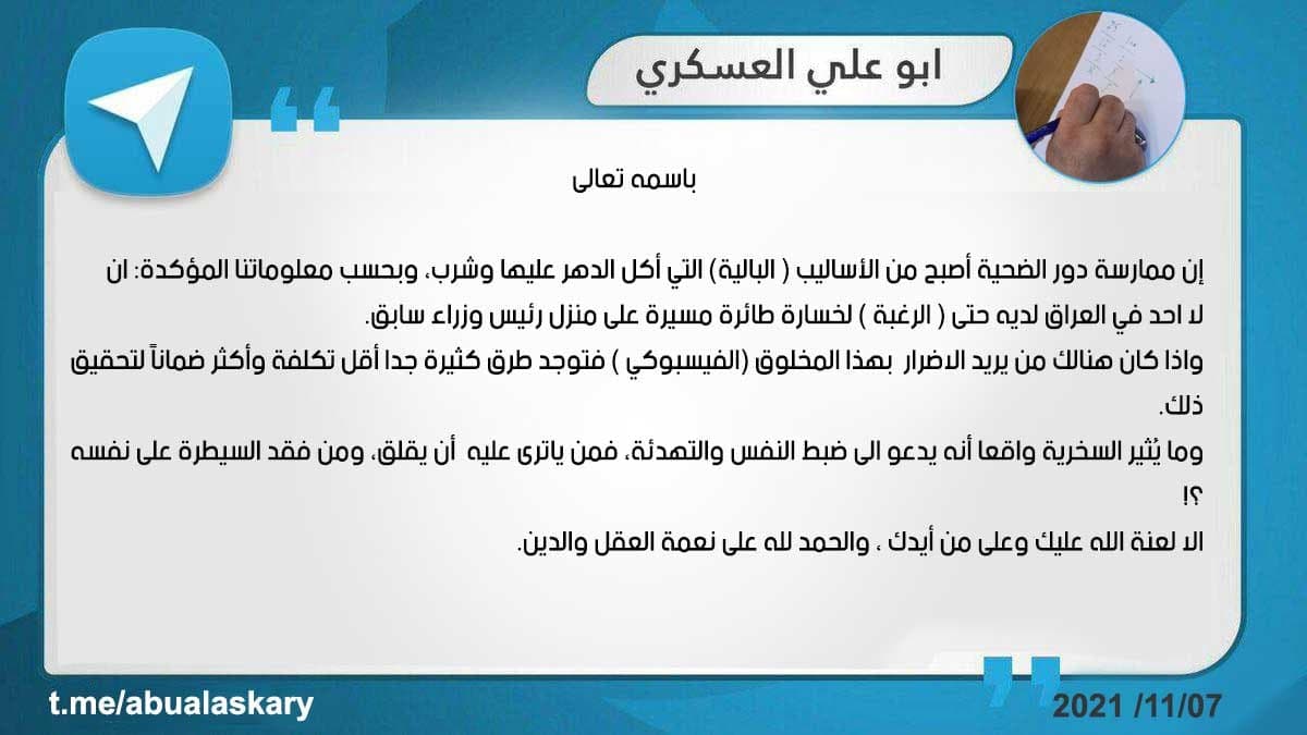 واتهم المسؤول الامني لكتائب حزب الله مصطفى الكاظمي بممارسة دور الضحية، قائلا: "بحسب معلوماتنا المؤكدة ان لا احد في العراق لديه حتى الرغبة لخسارة طائرة مسيرة على منزل رئيس وزراء سابق وممارسة دور الضحية اصبح من الاساليب البالية".