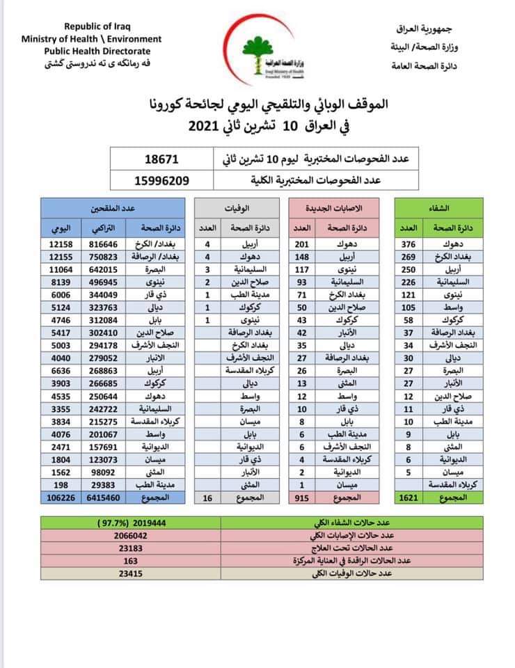 وقالت الوزارة في بيان، إن "كوادرها سجلت 915 إصابة جديدة، مقابل تماثل 1621 حالة للشفاء، وتسجيل 16 حالة وفاة".