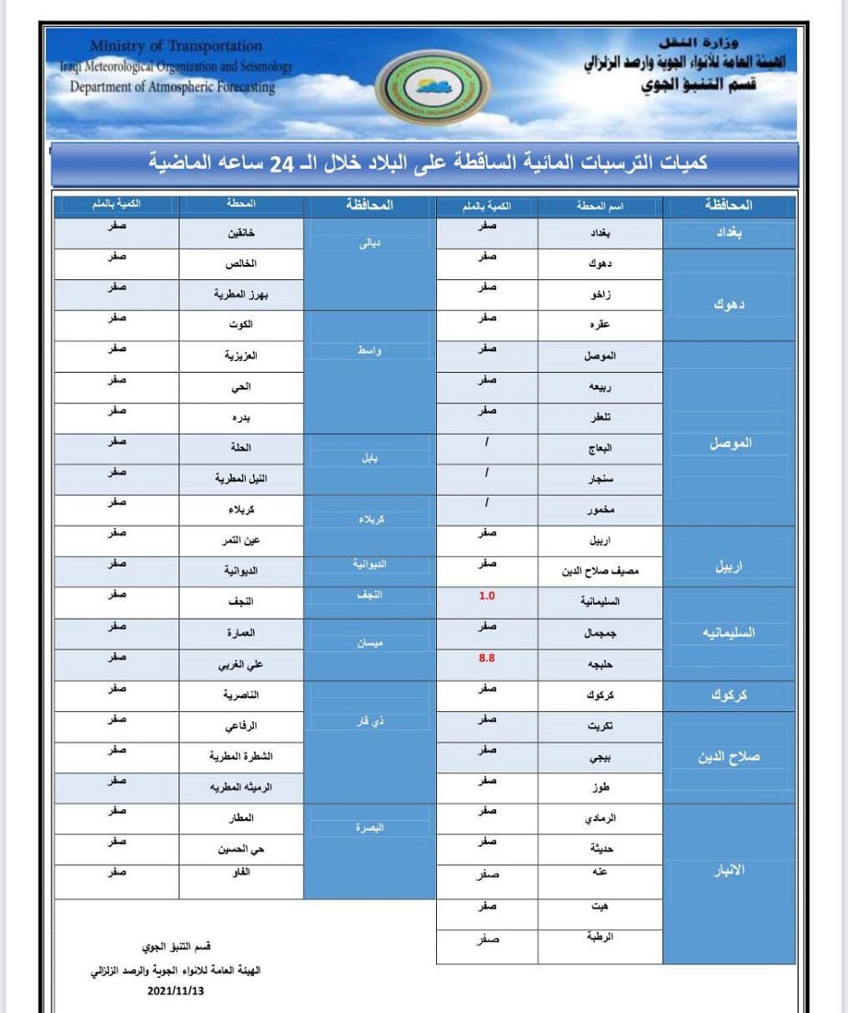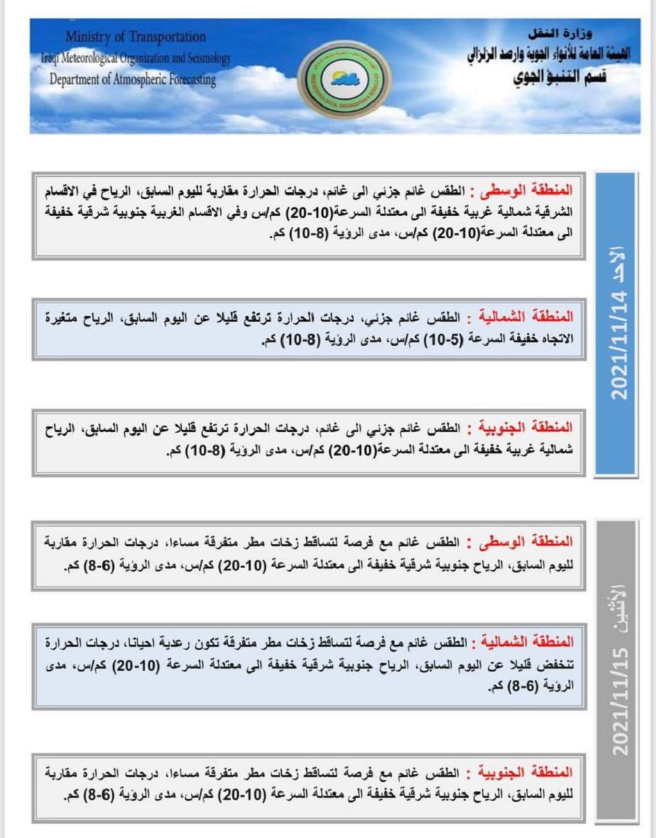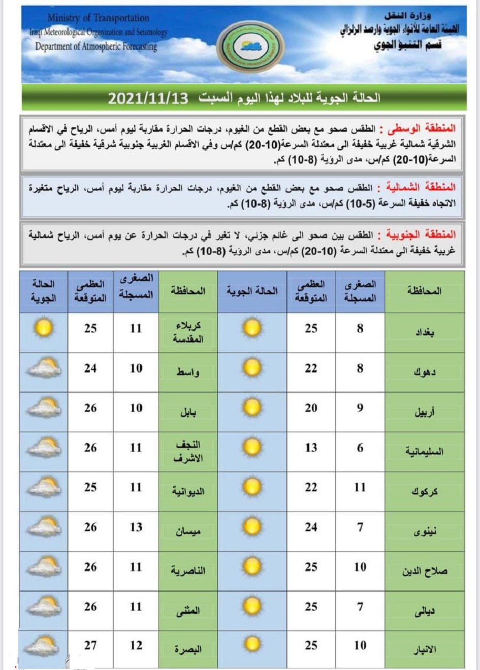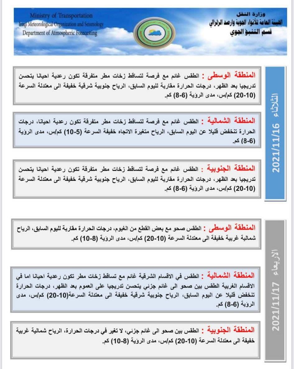 ادناه طقس العراق لهذا اليوم والايام الاربعة المقبلة مع كمية الامطار، بحسب ما صدر من الهيئة العامة للانواء الجوية والرصد الزلزالي.
