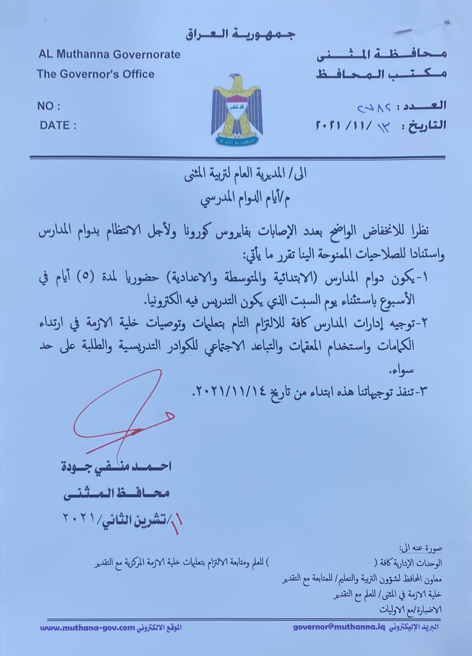 وبحسب وثيقة صادرة من مكتب المحافظ اليوم، (13 تشرين الثاني 2021)، فقد تقرر يكون دوام المدارس (الابتدائية، المتوسطة، الاعدادية) حضوريا لمدة 5 أيام في الأسبوع، باستثناء يوم السبت الذي يكون فيه التدريس الكترونيا.