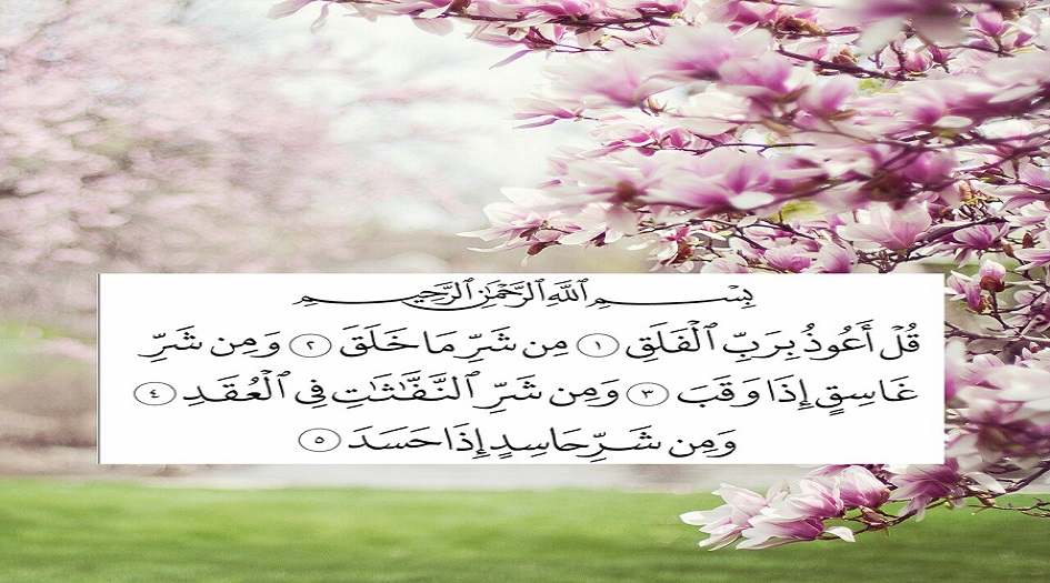 قُلْ أَعُوذُ بِرَب الْفَلَقِ(1) مِن شرِّ مَا خَلَقَ(2) وَ مِن شرِّ غَاسِق إِذَا وَقَب(3) وَ مِن شرِّ النَّفَّثَتِ فى الْعُقَدِ(4) وَ مِن شرِّ حَاسِد إِذَا حَسدَ(5)