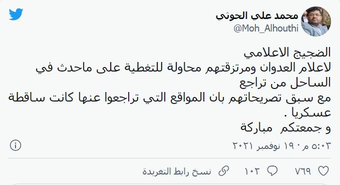 وقال الحوثي في تغريده له على "تويتر" الضجيج الاعلامي لاعلام العدوان ومرتزقتهم محاولة للتغطية على ماحدث في الساحل من تراجع مع سبق تصريحاتهم بان المواقع التي تراجعوا عنها كانت ساقطة عسكريا.