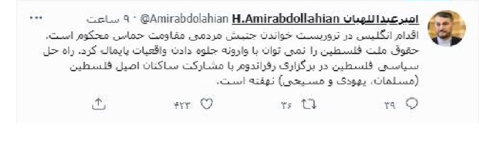 وكتب امير عبداللهيان في تغريدة له على موقع التواصل الاجتماعي "تويتر" اليوم الجمعة: نحن ندين قرار بريطانيا تصنيف حركة المقاومة الاسلامية في فلسطين المحتلة "حماس" كمنظمة ارهابية.