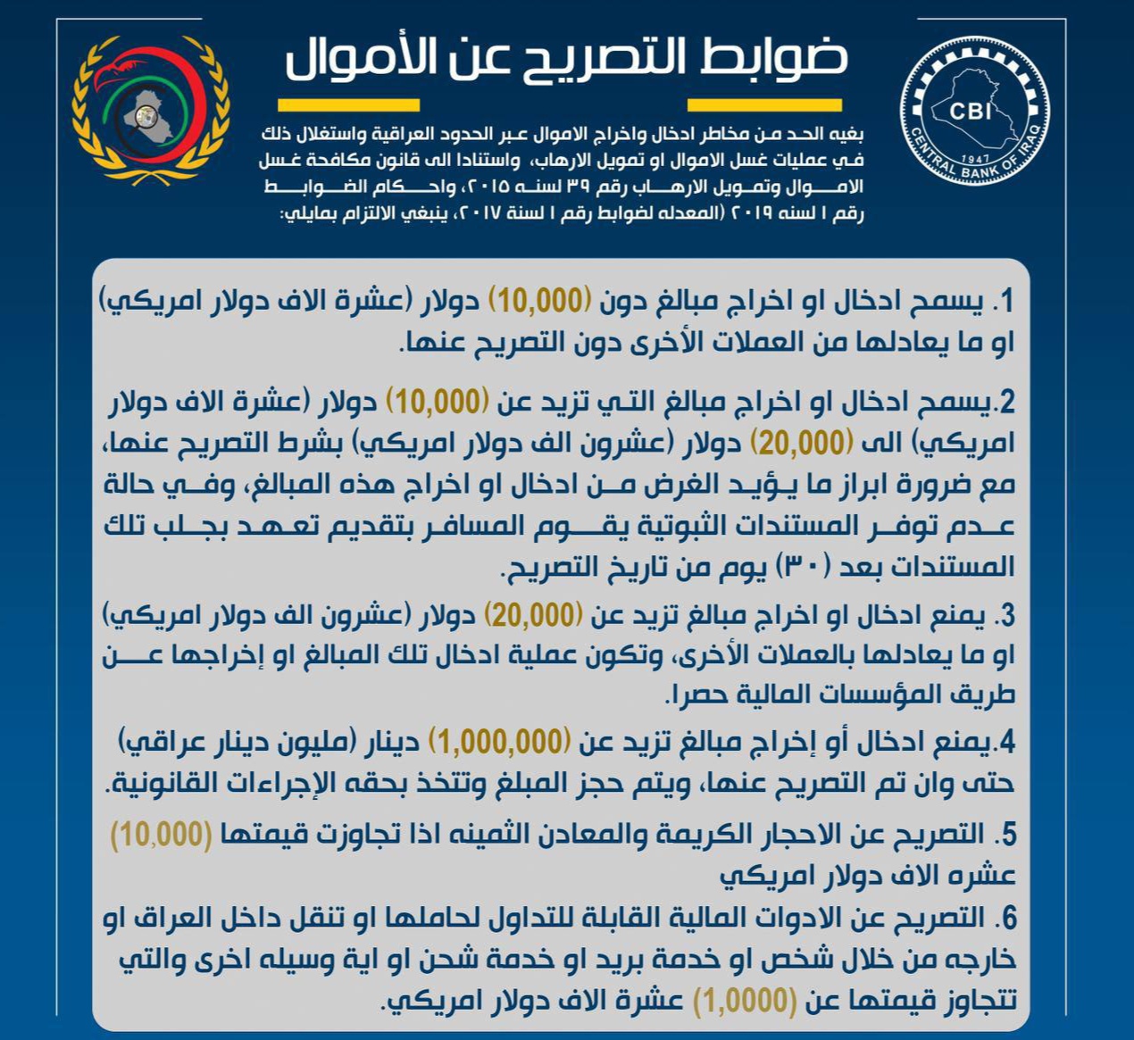 وقال البنك المركزي في بيان اليوم، (21 تشرين الثاني 2021)، ان ذلك جاء "بغية الحد من مخاطر ادخال واخراج الاموال عبر الحدود العراقية واستغلال ذلك في عمليات غسل الاموال او تمويل الإرهاب، واستنادا الى قانون مكافحة غسل الاموال وتمويل الارهاب رقم 39 لسنة 2015، واحكام الضوابط رقم 1 لسنة 2019 (المعدلة لضوابط رقم 1 لسنة 2017)".