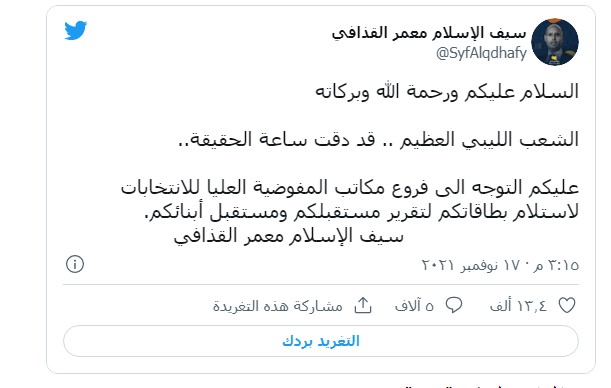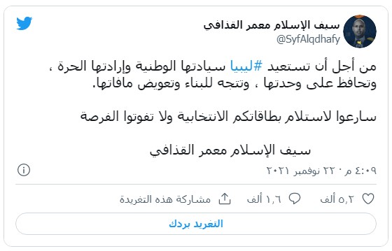 وكتب سيف الإسلام في أول تغريدة له بمنصة "تويتر" بعد إعادة فتح حسابه الذي أغلق لأيام، "من أجل أن تستعيد ليبيا سيادتها الوطنية وإرادتها الحرة، وتحافظ على وحدتها، وتتجه للبناء وتعويض مافاتها سارعوا لاستلام بطاقاتكم الانتخابية ولا تفوتوا الفرصة".