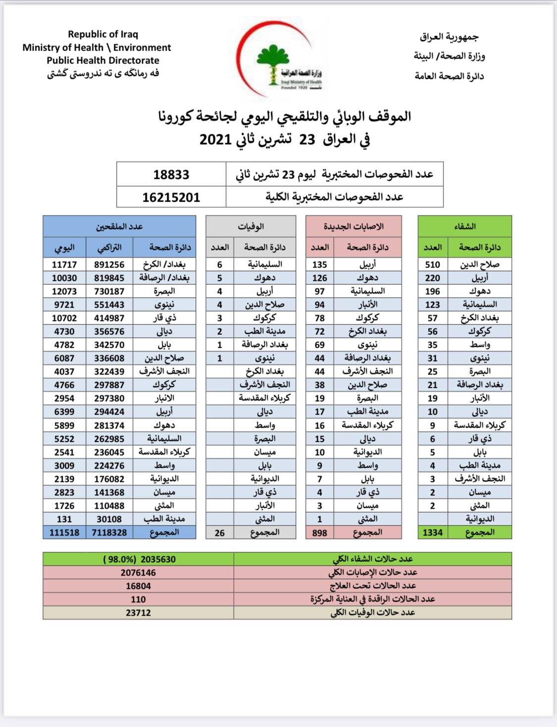 وقالت الوزارة في بيان، إنها "سجلت 898 إصابة جديدة، مقابل تماثل 1334 حالة للشفاء، مع تسجيل 26 حالة وفاة بالفيروس". وأشارت إلى "تلقي 111518 شخصاً للقاح كورونا في يوم واحد".