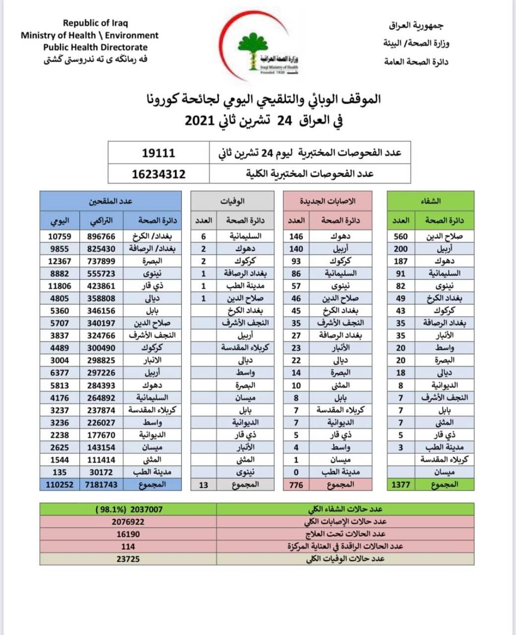وقالت الوزارة في بيان ، إن كوادرها "سجلت 776 حالة إصابة، و 1377 حالة شفاء، و 13 حالة وفاة بالفيروس". وأشارت إلى "تلقي 110252 شخصاً للقاح كورونا خلال يوم واحد".