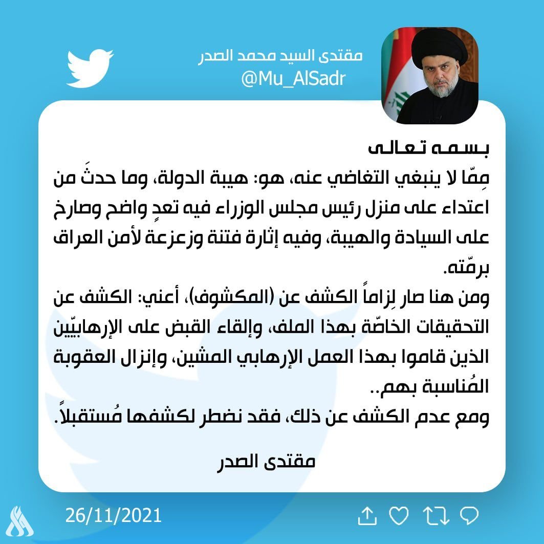 وقال السيد مقتدى الصدر في تغريدة، "مما لا ينبغي التغاضي عنه هو هيبة الدولة، وما حدث من اعتداء على منزل رئيس مجلس الوزراء فيه تعد واضح وصارخ على السيادة والهيبة وفيه اثارة ففتنة وزعزعة لأمن العراق برمته".