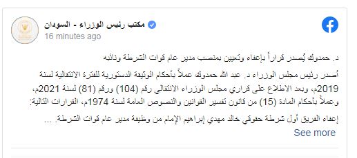 و بحسب مكتب رئيس الوزراء فقد أصدر حمدوك قرار بتعيين عنان حامد محمد عمر ؛ مديراً عاماً لقوات الشرطة و مدثر عبدالرحمن نصر الدين عبدالله نائباً له و مفتشاً عاماً للقوات.