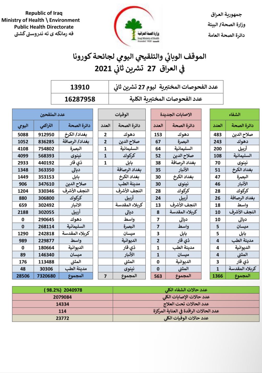 وقالت الوزارة في بيان ، إن "كوادرها سجلت 563 إصابة جديدة، مقابل تماثل 1366 حالة للشفاء، و7 حالات وفاة بالفيروس". وأشارت إلى "تلقي 28506 حالات للشفاء من كورونا في 24 ساعة".