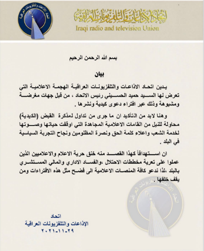 واكد البيان بان هذه الهجمة وما جرى من تداول مذكرة القبض هي محاولة للنيل من المقامات الاعلامية المجاهدة التي اوقفت حياتها وصوتها لخدمة الشعب.