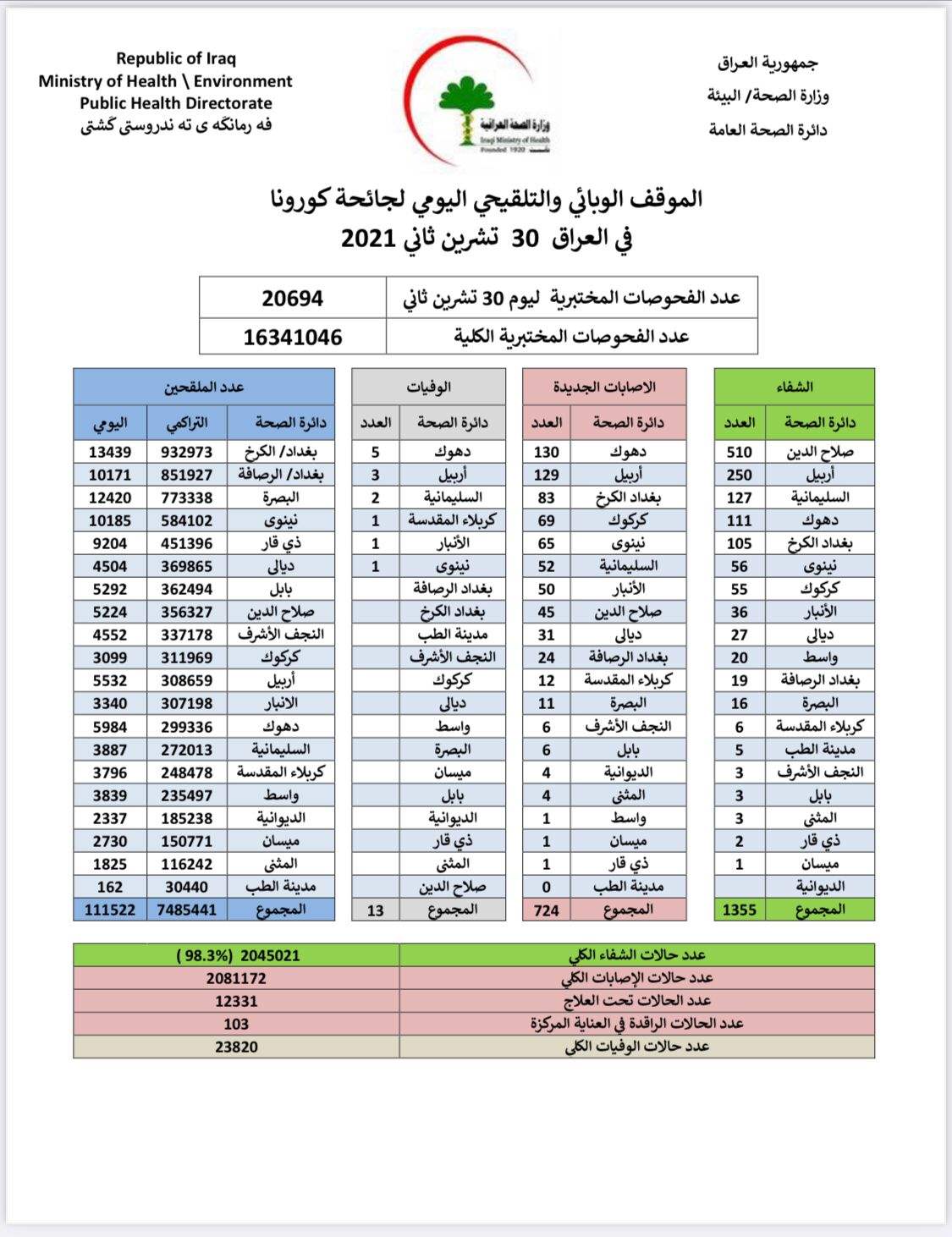 وقالت الوزارة في بيان ، إن كوادرها سجلت " 724 حالة إصابة جديدة، مقابل تماثل 1355 حالة للشفاء، و 13 حالة وفاة بالفيروس". وأشارت إلى تلقي 111522 شخصاً للقاح كورونا خلال 24 ساعة.