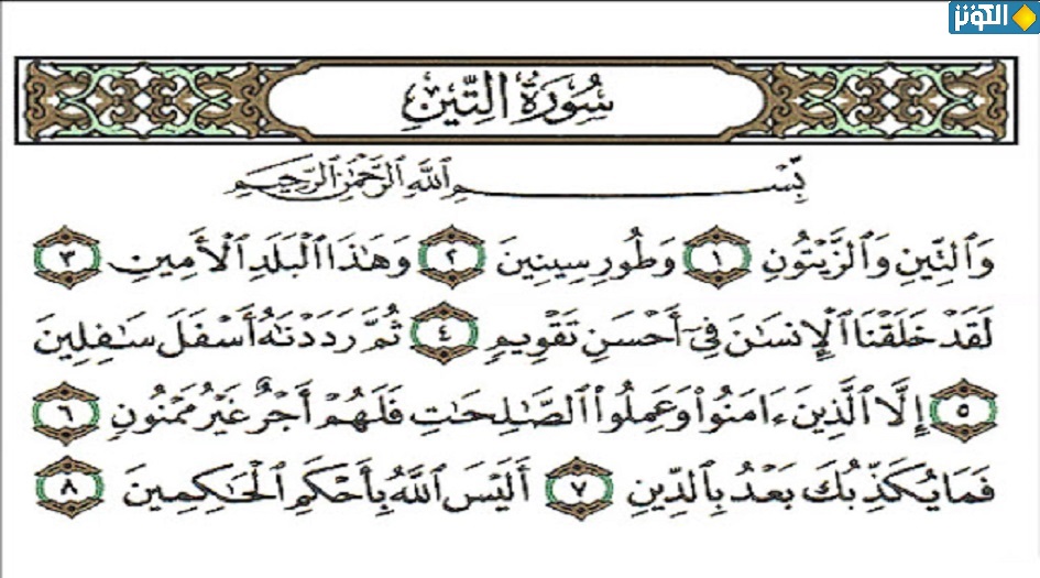 وَالتِّينِ وَالزَّيْتُونِ﴿1﴾ وَطُورِ سِينِينَ﴿2﴾ وَهٰذَا الْبَلَدِ الْأَمِينِ ﴿3﴾ لَقَدْ خَلَقْنَا الْإِنْسَانَ فِي أَحْسَنِ تَقْوِيمٍ﴿4﴾ ثُمَّ رَدَدْنَاهُ أَسْفَلَ سَافِلِينَ﴿5﴾ إِلاَّ الَّذِينَ آمَنُوا وَعَمِلُوا الصَّالِحَاتِ فَلَهُمْ أَجْرٌ غَيْرُ مَمْنُونٍ﴿6﴾ فَمَا يُكَذِّبُكَ بَعْدُ بِالدِّينِ﴿7﴾ أَلَيْسَ اللَّهُ بِأَحْكَمِ الْحَاكِمِينَ﴿8﴾