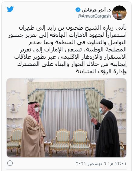 وكتب المستشار الرئاسي الإماراتي على حسابه في "تويتر" مشيرا إلى أن زيارة كبير مستشاري الأمن القومي الإماراتي طحنون بن زايد إلى إيران، تأتي "استمرارا لجهود الإمارات الهادفة إلى تعزيز جسور التواصل والتعاون في المنطقة وبما يخدم المصلحة الوطنية".