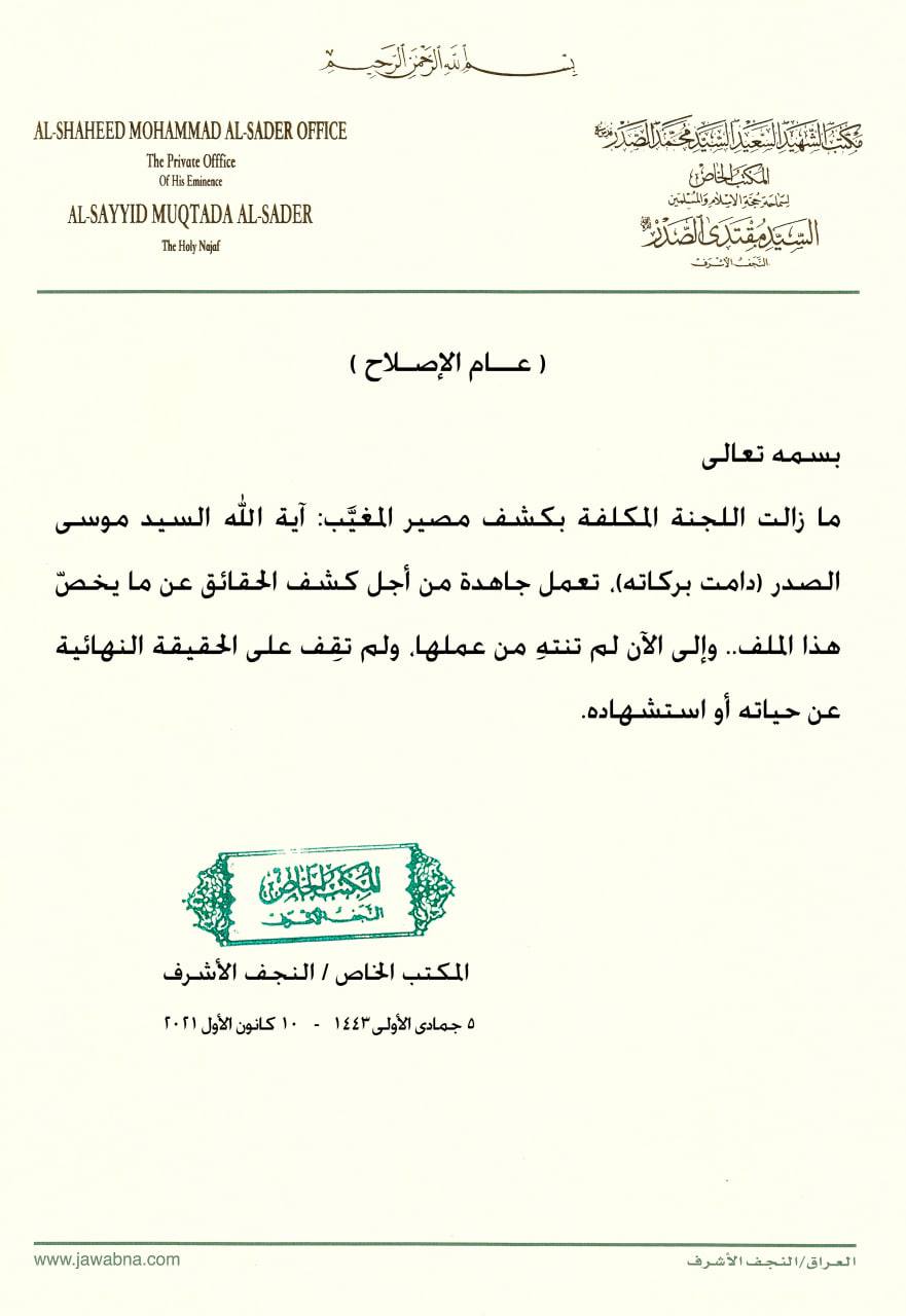 وقال المكتب الخاص لزعيم التيار الصدري، إن "اللجنة المكلفة بكشف مصير المغيّب موسى الصدر ما زالت تعمل جاهدة من أجل كشف الحقائق عن ما يخص هذا الملف.. وإلى الآن لم تنته من عملها"